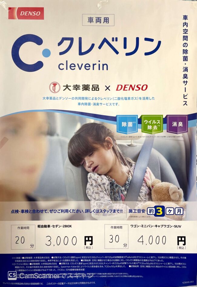 車両用クレベリン cleverin『大幸薬品×DENSO』20分2,000円~施工できます。